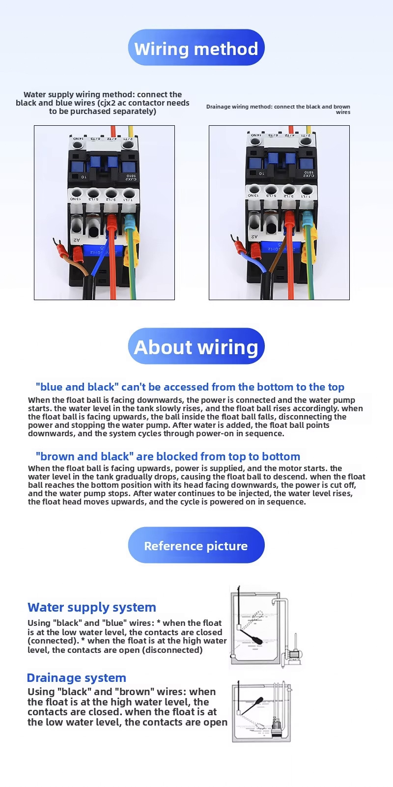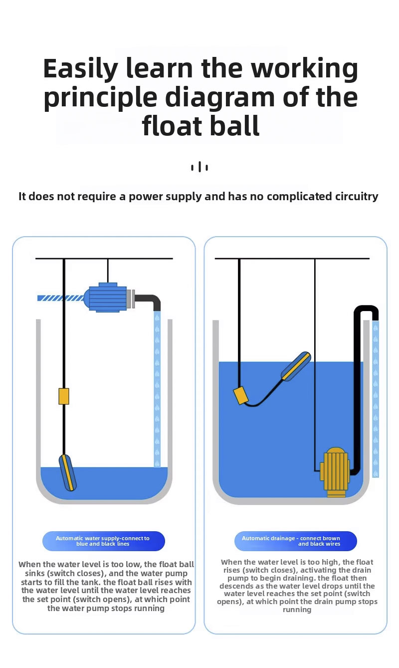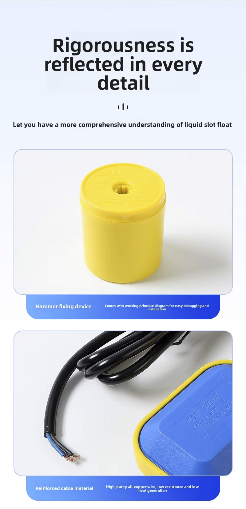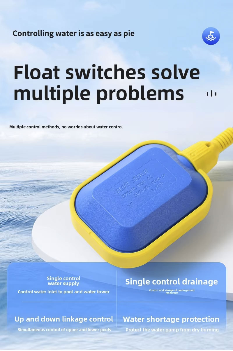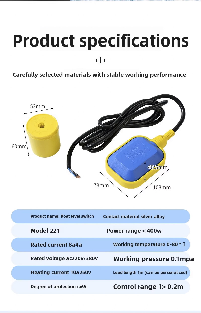 Sakelar pelampung ini memiliki desain melingkar besar dengan tingkat perlindungan 2m, 3m, 5m, 10m, IP68, dan beroperasi pada suhu dari 0 ℃ hingga 80 ℃, mendukung rentang tegangan lebar 110V hingga 220V dan memiliki tekanan kerja yang kuat ± 0,5Mpa. Produk dapat disesuaikan dengan ukiran laser, logo timbul, atau layanan OEM/ODM, memastikan kemampuan beradaptasi untuk beragam aplikasi.